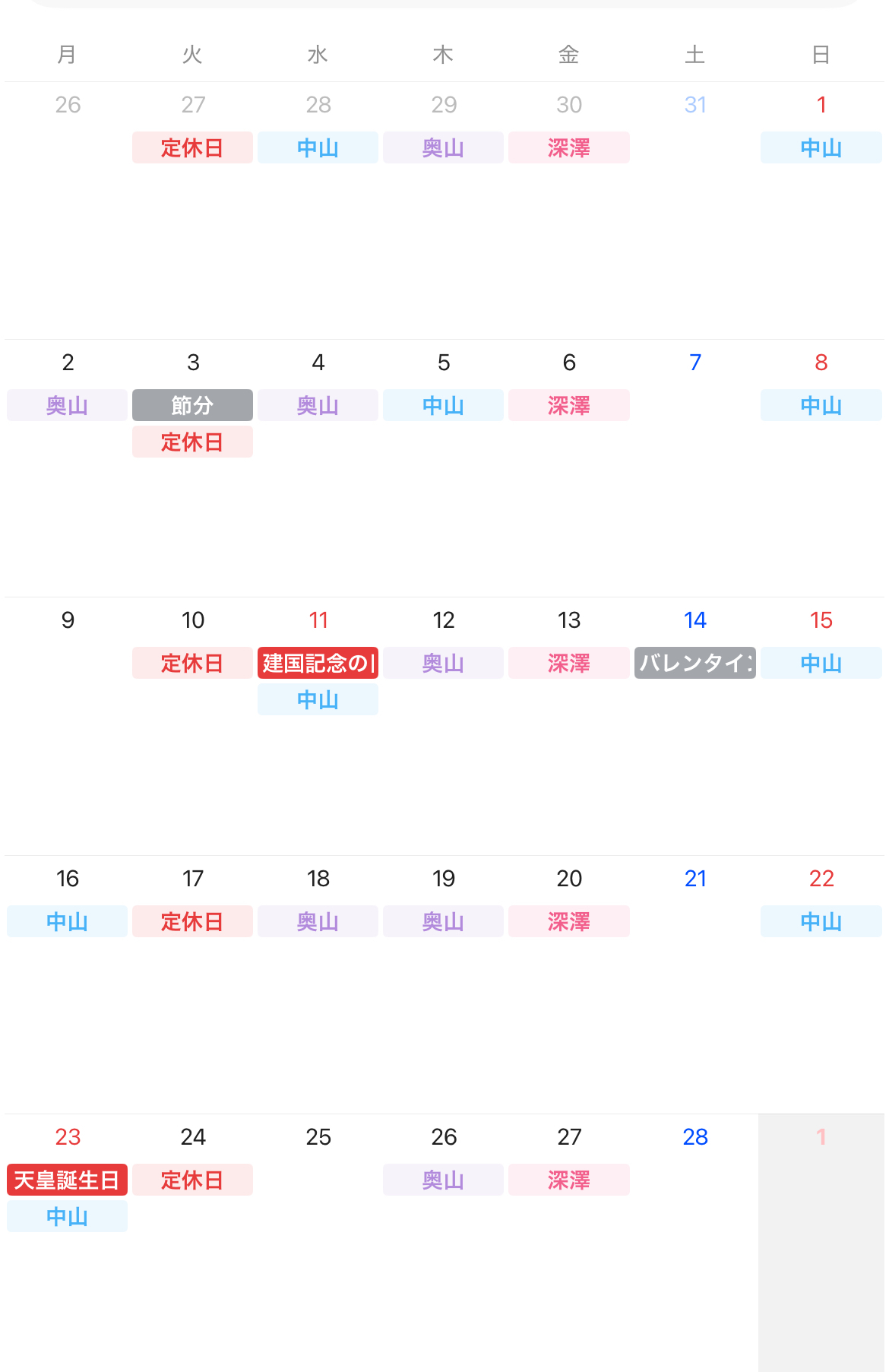 名前の付いている日がお休みとなります。